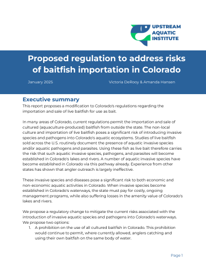 The Colorado Aquaculture Association and National Aquaculture Association collaborated to analyze a petition filed by an animal rights organization, Upstream Policies, with the Colorado Parks and Wildlife requesting new state regulations to ban live bait fish importation. To access these documents, click on “petition” and “analysis.”