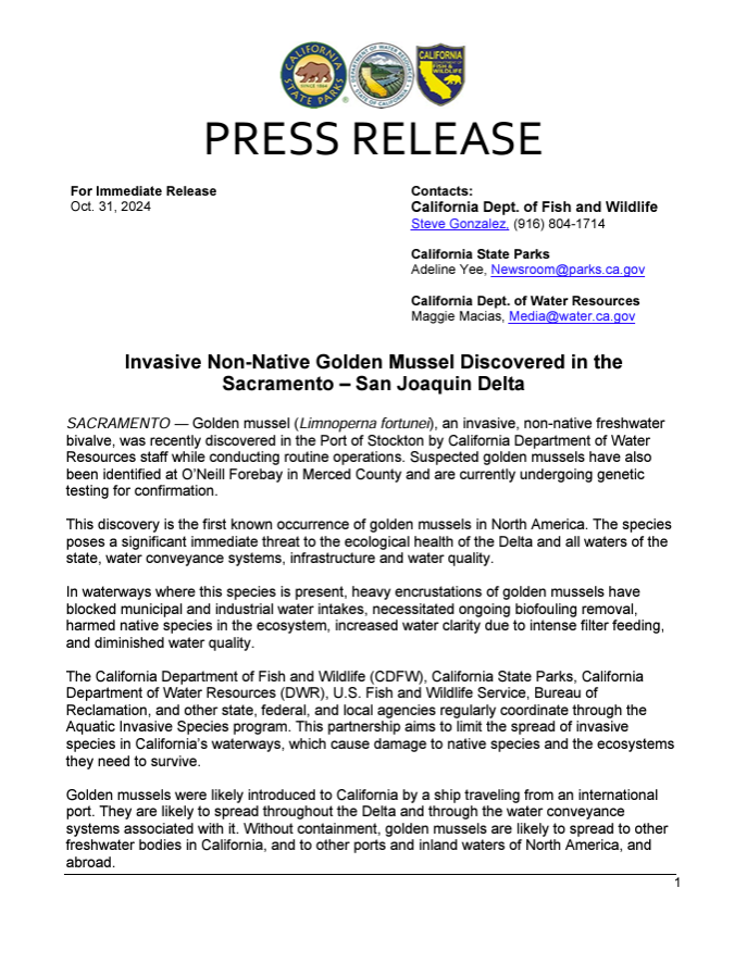 A small freshwater mussel, proven to be invasive in other countries, has been found in California. Species information can be found here: Golden Mussel (Limnoperna fortunei) - Species Profile and Species Profile - Golden Mussel.