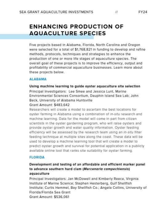 Five projects based in Alabama, Florida, North Carolina and Oregon were selected for a total of $1,768,821 in funding to develop and refine methods, protocols, techniques and strategies to enhance the production of one or more life stages of aquaculture species. The funded research will specifically answer questions related to oysters, hard clams, macroalgae, striped bass and red seaweed. The overall goal of these projects is to improve the efficiency, output and profitability of commercial aquaculture businesses.